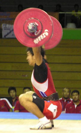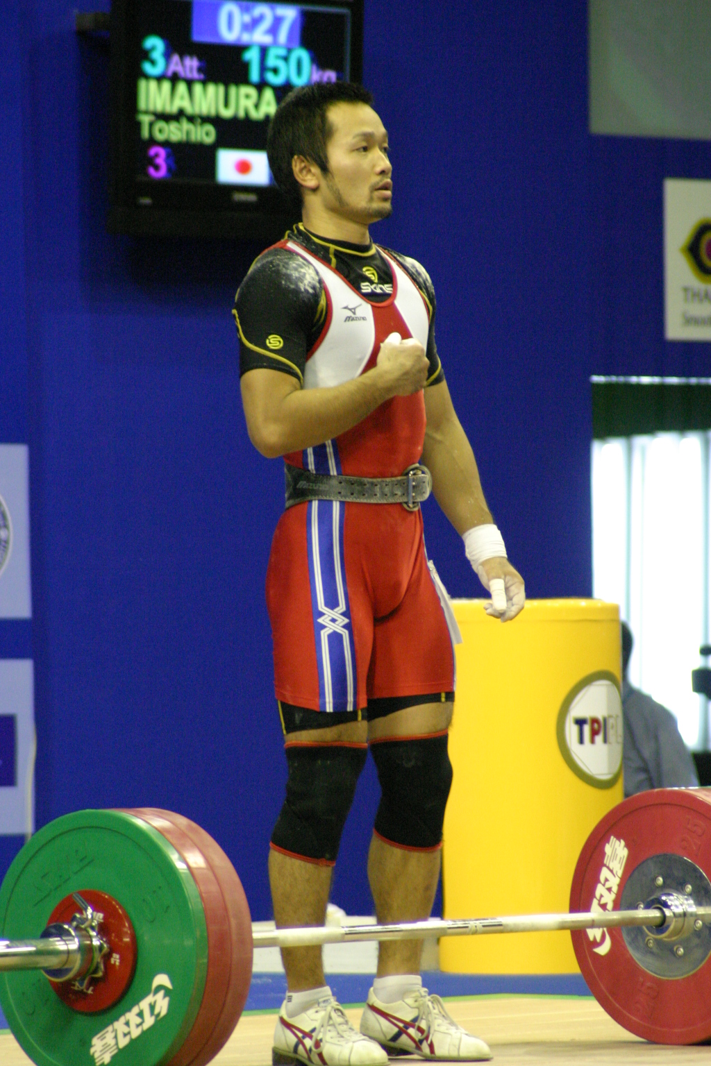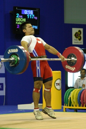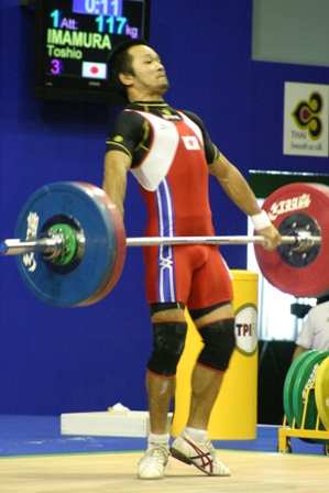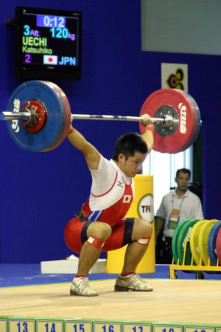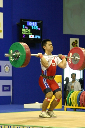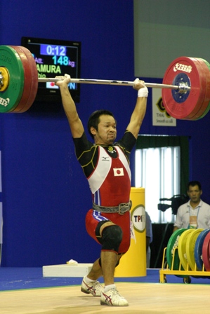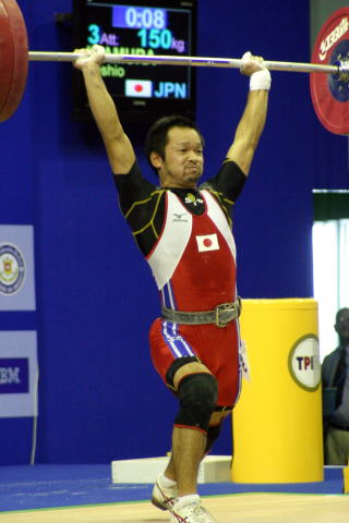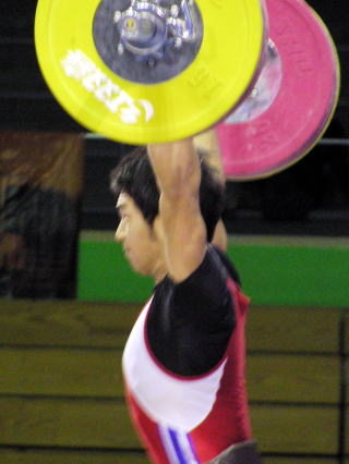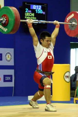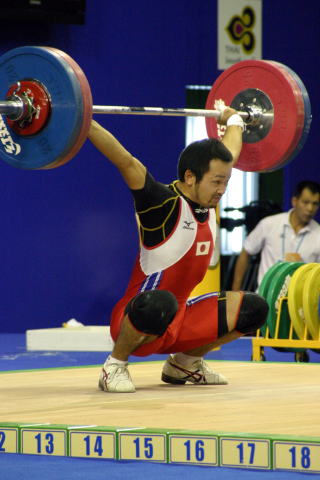スナッチを全試技成功させ,続くジャーク1回目も難なく成功させた.Dグループのため,2回目以降は得点圏に望みを掛けての増量だった.